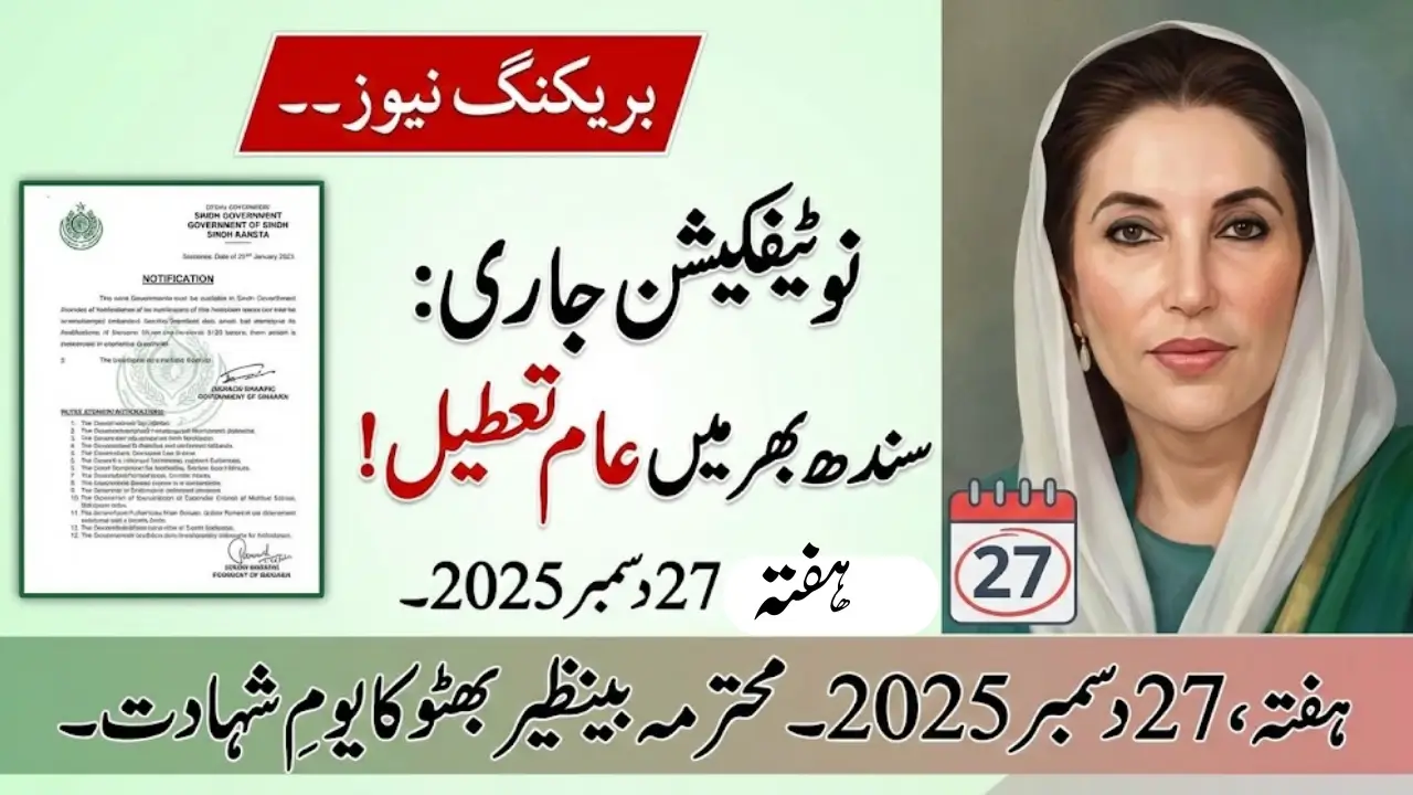 The Sindh government has issued a formal notification declaring a holiday across Sindh on Saturday, December 27, 2025, on the occasion of the eighth death anniversary of Prime Minister and Chairperson of the Pakistan People’s Party Benazir Bhutto.