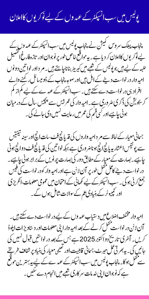 The PPSC Sub Inspector Jobs 2025 offer an incredible opportunity for graduates to begin their careers in Punjab Police. With clear eligibility criteria, defined physical standards, and a structured selection process, aspirants can strategically prepare to succeed. Applying online through the official PPSC portal ensures a smooth and efficient submission process. This recruitment drive emphasizes merit, physical fitness, and academic qualification, making it a fair and transparent process for all eligible candidates in Punjab.
