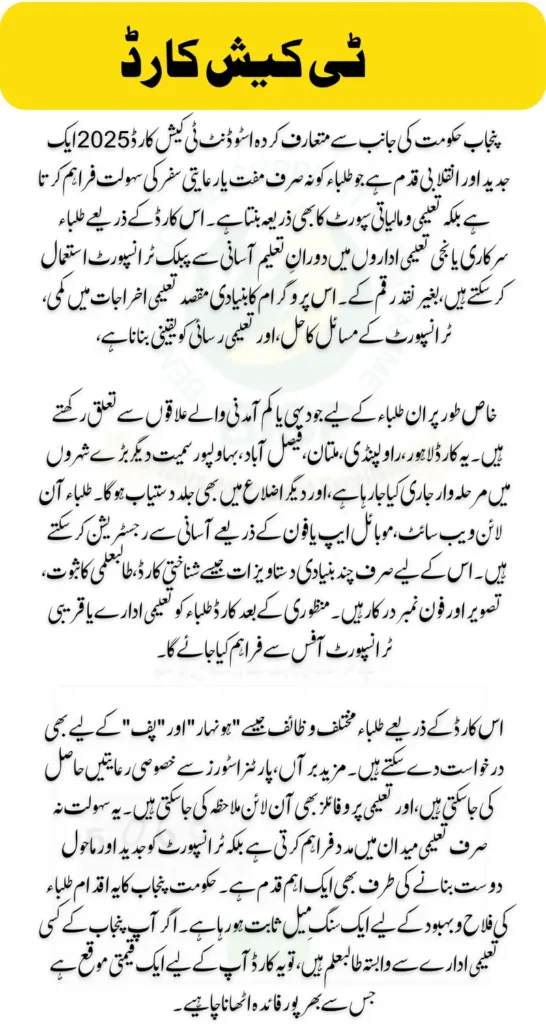 The Punjab Student T-Cash Card 2025 is more than a convenience — it’s a step toward empowering students with accessible transport and academic tools. From saving daily commute costs to opening doors for scholarships and student benefits, this card is a valuable support system.